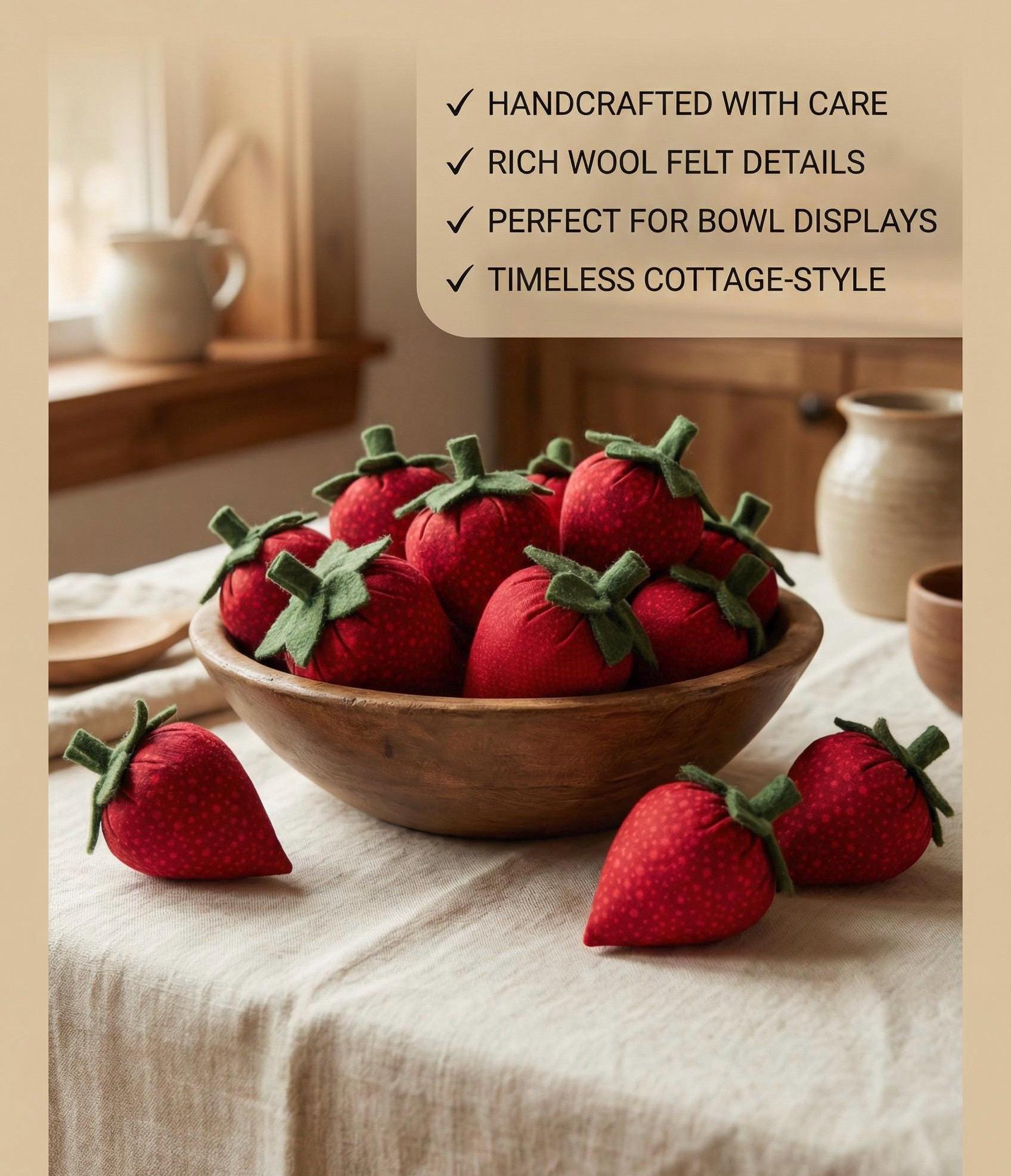 Bring a touch of timeless charm into your home with this delightful set of six handmade strawberries. Each piece is carefully crafted from soft red fabric, shaped to a plump 3x2.5 size that rests beautifully in the palm of your hand. The leaves are cut from rich wool felt, giving each strawberry a natural and rustic finish.