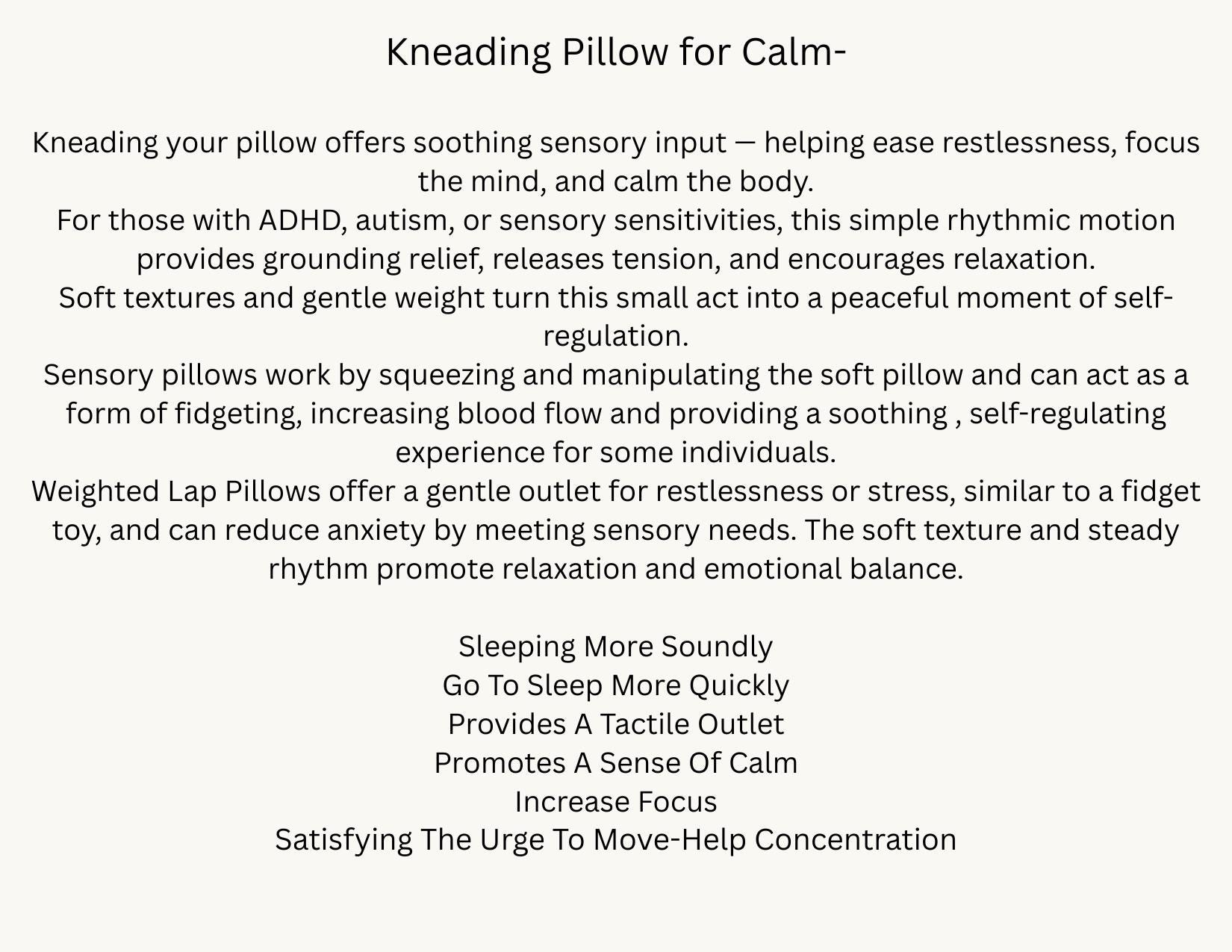 A comforting aid for those living with chronic illness. The gentle, even weight helps ease tension, calm nerves, and support relaxation for sore muscles, arthritis, fibromyalgia, stress fatigue, autism and chronic pain. ADHD-PTSD-OA/RA-FM-MS-PN-GAD-MDD-CFS/ME-SLE