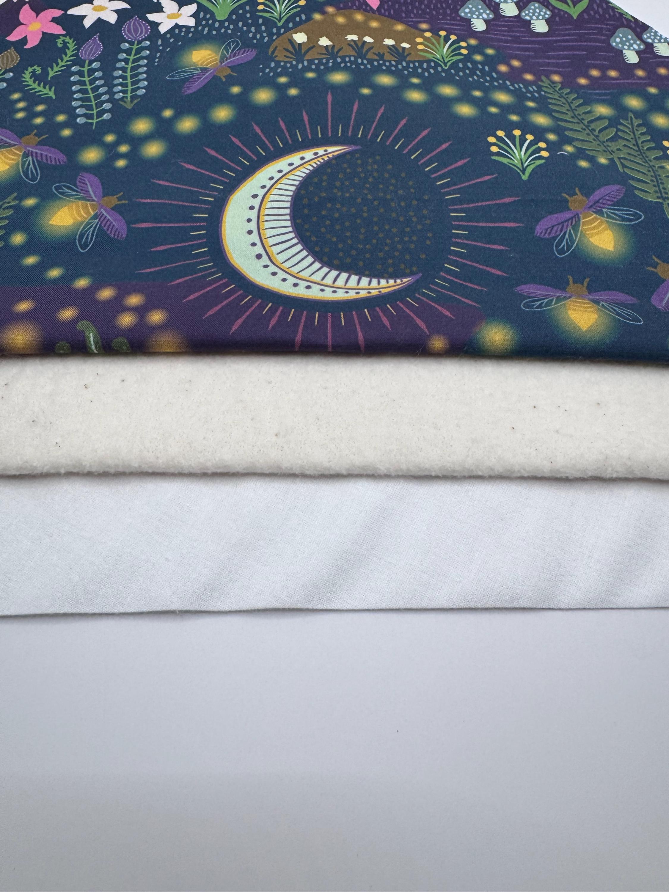 • Front: decorative designer fabric, fabric stabilizer, natural cotton batting